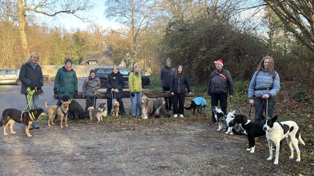 Eine Gruppe von 10 Menschen und 13 Hunden machte sich um 14 Uhr auf eine sehr schöne Runde durch den Wald zwischen Lintorf und Angermund.